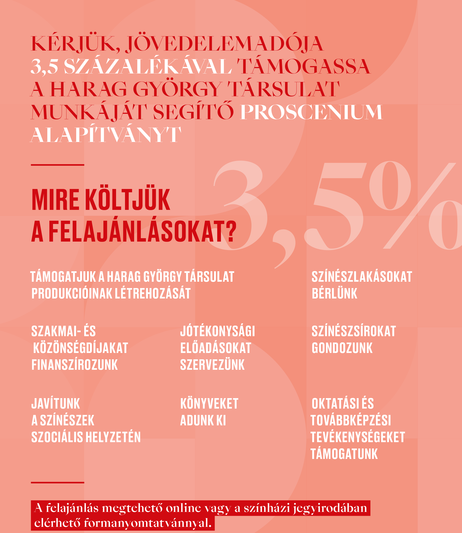 Kérjük, idén a felajánlható 3,5 százalékkal támogassa a Harag György Társulat munkáját segítő Proscenium Alapítványt, vagy a Brighella Bábtagozatot segítő Art Project Egyesületet!